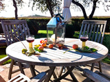 großer Jugenstilofen, eingebaute Fritteuse, Haarföhn, Palmdusche, Edelstahlhandtuchwärmer, Strandkorb, Terrassenstrahler
