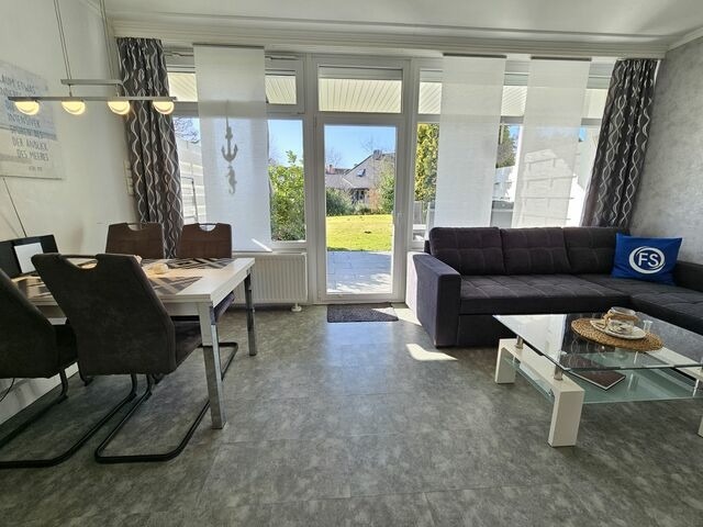 Willkommen in der Ferienwohnung 2002 Kiek-mol-wedder-in Whg.5. Großzügige, top ausgestattete drei Zimmer Wohnung für bis zu vier Personen im Erdeschoss mit W-LAN, großzügiger Terrasse in Südwestlage. Die Wohnung verfügt über ein helles Wohnzimmer mit Panoramafenster, offener Küche, Zwei Schlafzimmer, Duschbad und ein separates WC, sowie ein Stellplatz vor dem Haus runden dieses wirklich tolle Angebot ab. Genießen Sie den Panoramablick auf das große Gartengrundstück in einer ansprechenden Atmosphäre.. Die Ferienwohnung "2002 Kiek-mol-wedder-in Whg.5" ist liebevoll eingerichtet und ist wie folgt aufgeteilt: Sie fahren mit Ihrem Fahrzeug auf Ihren festen Stellplatz (Nr. 5) direkt vor dem Haus, steigen aus und gehen zum Eingang. Wenn Sie die Wohnungstür öffnen, stehen Sie im Flur hier befindet sich auf der linken Seite die offene Küche mit Mikrowelle, Ceranfeld, Wasserkocher usw. Von diesem Flur mit Garderobe gelangen Sie ins ... Schlafzimmer (1) mit zwei Einzelbetten (100 cm x 200 cm), Fensterrolladen, Kleiderschrank und Nachtleuchte. Duschbad mit Dusche, Waschbecken und Wandspiegel und ein separates WC. Nun gehen Sie ins Wohn-/Esszimmer, wo sich auf der linken Seite der Essbereich mit Tisch und Stühlen befindet, rechts ist der Wohnbereich mit TV, Sofa, großes Panoramafenster mit elektrisch betriebene Rolladen und direktem Zugang zur großzügigen Terrasse in Südwestlage mit zwei Garten-Sonnenliegen und einem Bollerwagen. Genießen Sie den Panoramablick auf das große Gartengrundstück in einer gemütlichen und ansprechenden Atmosphäre. Hinter dem Wohnbereich befindet sich der zweite innenliegende Schlafbereich mit einem Doppelbett (2x90 x 200 cm) , Kleiderschrank und Nachtleuchte. Bitte haben Sie Verständnis, dass es sich bei diesem Ferienobjekt um ein Nichtraucherobjekt handelt. Bettwäsche & Handtücher: Das Wäschepaket kann gerne kostenpflichtig pro Person dazu gebucht werden und beinhaltet: 1 x Kopfkissenbezug, 1 x Bettdeckenbezug, 1 x Bettlaken, 1 x Duschhandtuch, 2 x kl. Handtücher, sowie 1 x Duschvorleger und 1 x Geschirrhandtuch. Tiere: Ab 2025 sind keine Hund in diesem Ferienobjekt mehr gestattet! Fewo-Suhr heißt Sie "Herzlich Willkommen" im "2002 Kiek-mol-wedder-in Whg.5"!