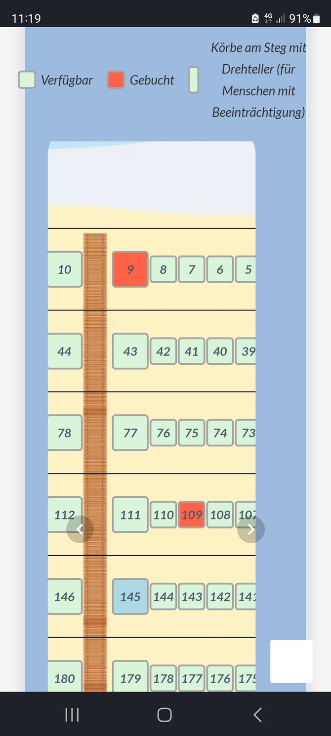 Ab Ostern bis Ende September steht Ihnen ein Strandkorb in der 4. Reihe nähe Kinderhafen zur Verfügung bereit. Strandkorb Nr. 109.