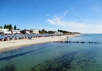 Blick auf den Strand © Frank Horn Eines der ältesten Seebäder der Ostsee ist wohl das Seebad Grömitz mit seinem weiten, weißen Sandstrand und der Steilküste. Die Tauchgondel am Ende der Seebrücke bietet einen einmaligen Blick auf die Unterwasserwelt der Ostsee. Kinder haben in Grömitz die Möglichkeit, die „Coole Schule“ zu besuchen, in der sie Surfen und Segeln lernen oder einfach Fußball spielen können.