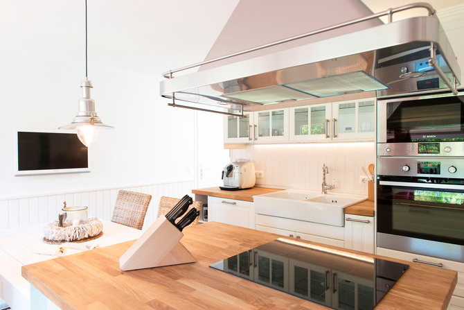 Offener Küchenbereich mit freistehendem Kochblock, großer Flat TV in der Küche, Kaffeevollautomat, großer HD Flat TV im Wohnzimmer, Flat TV im Schlafzimmer, Fahrradgarage mit Stromanschluss für E-Bikes, Strandkorb im Garten, zusätzliches Gäste-WC