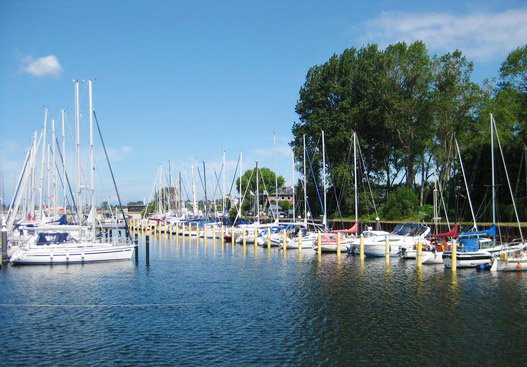 Eine dort am Ufer erstellte slaw. Hafenanlage mit Bootshäusern, Naust und dem weltweit ersten originale Nachbau eines slawischen Handelsschiffes sind zu besichtigen.