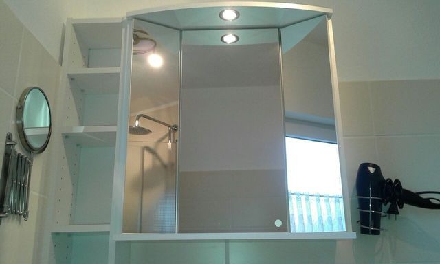 Flachbildschirmfernseher mit einem Durchmesser von 80 cm. Neues Duschbad mit ebenerdigem Duscheinstieg.