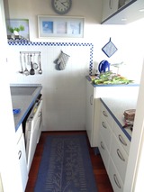 Die Wohnung im oberen der zweigeschossigen Anlage ist mit einer Zentralheizung ausgestattet und ganzjährig bewohnbar. Sie ist 65 m² groß, ansprechend möbliert und verfügt über eine gut ausgestattete integrierte Küche (z.B. leiser Geschirrspüler und Dunstabzug, außerdem Cerankochfeld, el. Backofen).