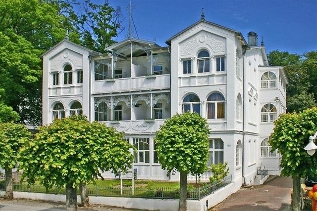 Kurzbeschreibung: Herzlich Willkommen in diesem großen, modern eingerichteten Ferienappartement. Auf 60 qm bietet diese Wohnung bequem Platz für 6 Personen und besticht besonders mit ihren zwei gemütlichen Wintergärten. Lagebeschreibung: Dieses moderne Ferienappartement liegt im beliebten Ostseebad Sellin. Hier finden Sie auch die berühmte Seebrücke des Tourismusortes, die bei all unseren Gästen auch sehr beliegt ist. Das Appartement befindet sich nur 300 Meter vom feinsandigen Ostseestrand an der berühmten Seebrücke entfernt. Somit sind diese Sehenswürdigkeit sowie der lange Ostseestrand in kürzester Zeit zu erreichen. Genießen Sie also gern Ihren nächsten Strandurlaub bei uns. Die Ferienwohnung liegt in der schönen Wilhelmstraße, in der viele prunkvolle Villen im berühmten Bäderstil stehen, wie zum Beispiel auch unser Haus Arkona, in der sich dieses Ferienappartement befindet. Sellin ist außerdem perfekter Ausgangspunkt für verschiedene Ausflüge auf der Ostseeinsel. Von hier aus erreichen Sie schnell weitere schöne Ostseebäder oder auch das Mönchgut oder den Königsstuhl auf der Insel Rügen. Sie haben die Möglichkeit via Fahrrad, zu Fuß oder mit dem Auto zu erkunden oder aber auch mit der Eisenbahn. Der "Rasende Roland", unsere historische Dampf-Eisenbahn auf der Insel Rügen, bringt Sie gerne zu den nahe gelegenen Ostseebädern. Ausstattungen: Dieses Komfort-Appartement des Typ Jasmund ist circa 60 qm groß und bietet somit bequem Platz für bis zu 6 Feriengäste. In drei verschiedenen Zimmern bietet diese Wohnung Ihnen jeweils zwei Schlafplätze. Im separaten Schlafzimmer finden Sie ein Komfort-Doppelbett. Von diesem Raum haben Sie einen direkten Zugang zu einem kleinen Wintergarten. Im zweiten Wintergarten des Appartements, der an den großen Wohn- und Essbereich anschließt, befindet sich eine Schlafcouch, auf der Nachts zwei weitere Personen bequem schlafen können. In dem großen Wohn- und Essbereich befindet sich eine weitere Schlafcouch, auf der Sie über Tag sowie Nachts mit zwei Personen entspannen können. Ein Smart-TV steht Ihnen hier zu Ihrer Unterhaltung zur Verfügung. In diesem großen Raum befindet sich ebenfalls eine Küchenzeile, die neben einem 4-Platten-Herd sogar über einen Backofen verfügt. Nachdem Sie in dieser Küche, die über alle benötigten Utensilien verfügt, Ihre köstlichen Mahlzeiten zubereitet haben, können Sie diese direkt an dem großzügigen Esstisch daneben genießen. Das modern geflieste Bad verfügt über WC und Dusche.