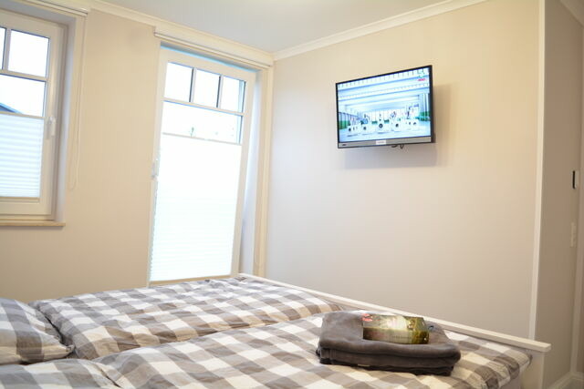 Fenster haben alle Insektenschutz, Verdunklungsmöglichkeit und TV in den Schlafräumen, Bollerwagen für Strandausflüge, Kinderreisebett, Bügelbrett, voll ausgestattete Küche ...
