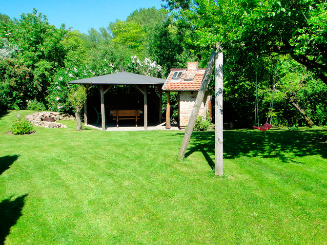 Das großzügige Wohnzimmer mit Fernseher, DVD-Player, Radio und einem separaten Essbereich bietet genügend Platz für die ganze Familie und Blick in den großen Garten. Das Wohnzimmer ist mit Laminat ausgestattet.