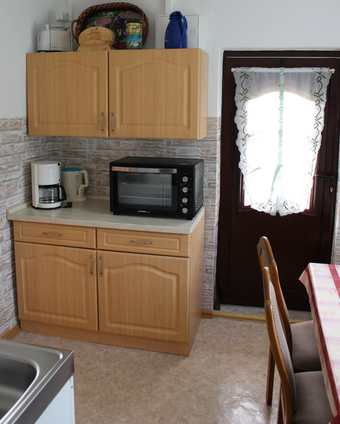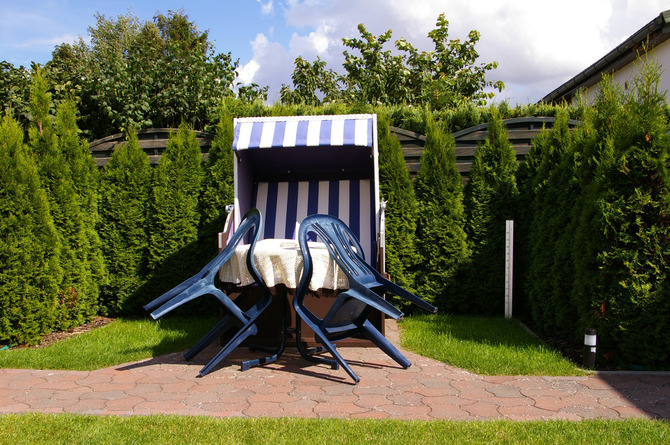 Er befindet sich hinter unserem Wohnhaus auf unserem Grundstück in einem Wohngebiet von Einfamilienhäusern. Vor dem Bungalow, der für 3 Personen ausgelegt ist, befindet sich eine kleine Terrasse mit Hollywoodschaukel und Gartenstühlen, sowie ein Grillkamin.