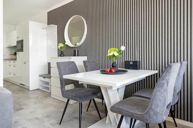 Küche: Airfryer Badezimmer: Dusche (Einstiegshöhe: 12cm), WC, Haartrockner, beheizbarer Handtuchhalter, Fenster Terrasse: 6m², Ausrichtung: Süden, grillen: nicht erlaubt